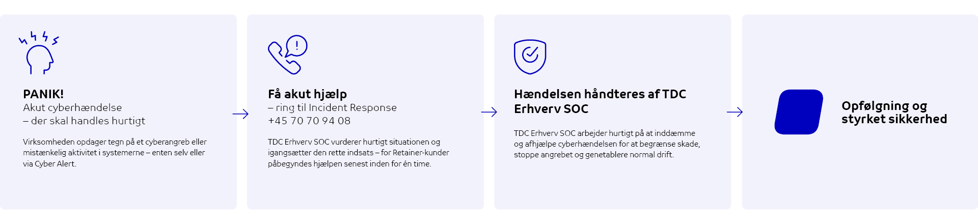 I får direkte adgang til TDC Erhvervs IR-specialister, som er klar til at handle døgnet rundt – hvor vi sikrer, at hjælpen igangsættes senest 1 time efter et angreb er konstateret.